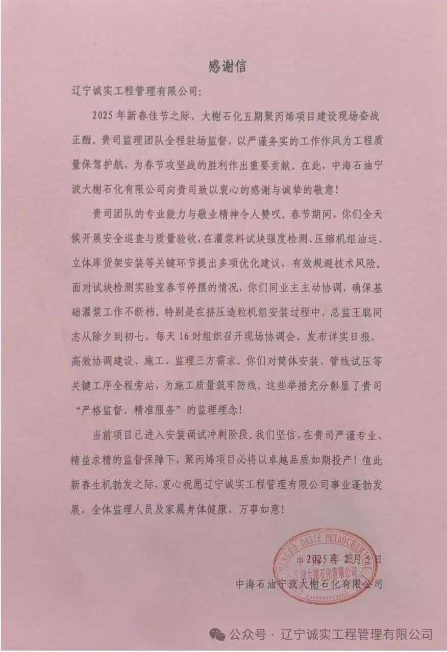 202525日,当许多人仍沉浸在新春佳节的喜悦之中时,中海油大榭石化五期聚丙烯项目监理部以专业、奉献的精神为项目安装调试冲刺的关键过程保驾护航,并收获到来自中海石油宁波大榭石化有限公司发来的一封感谢信。